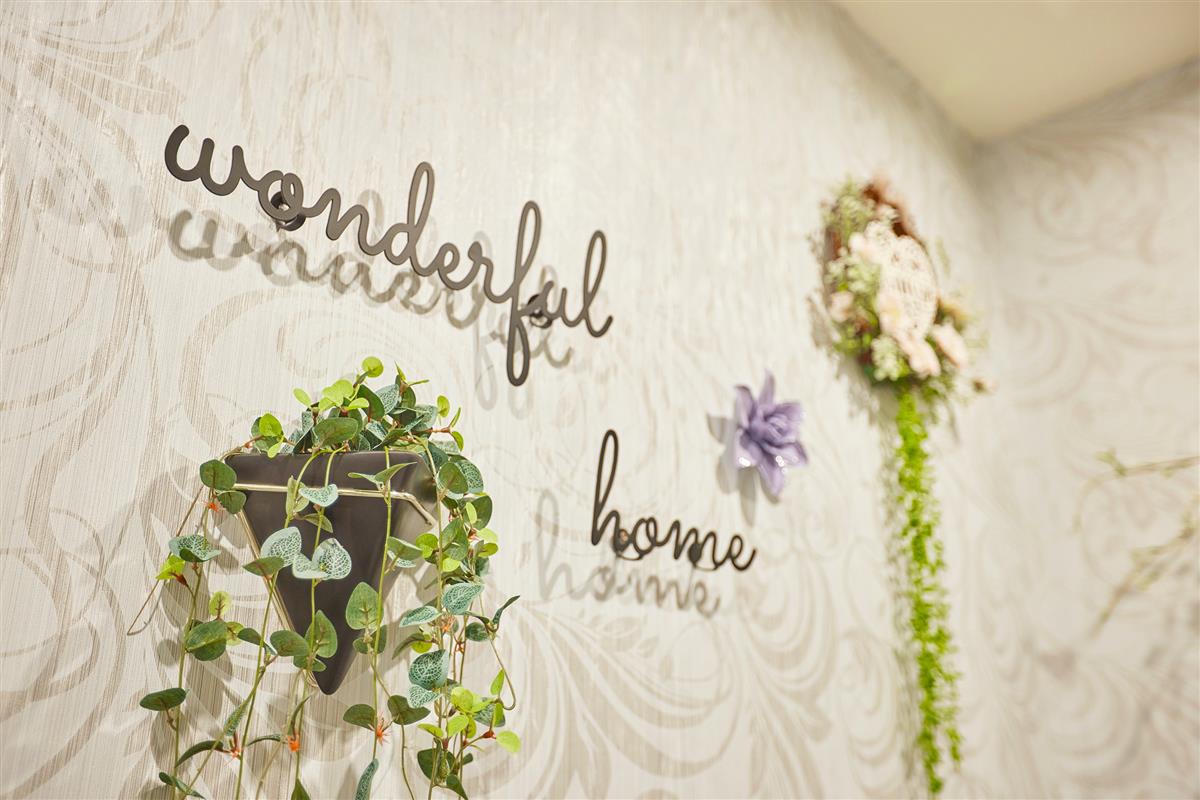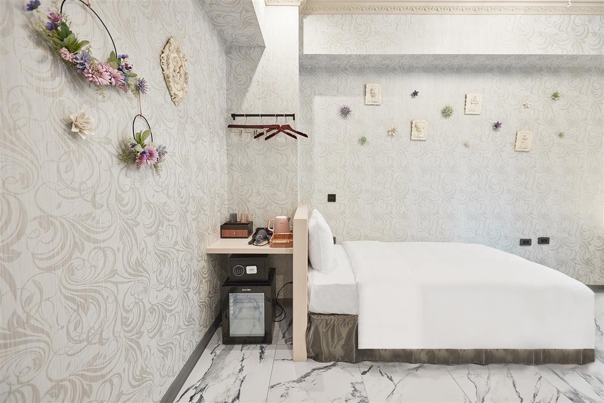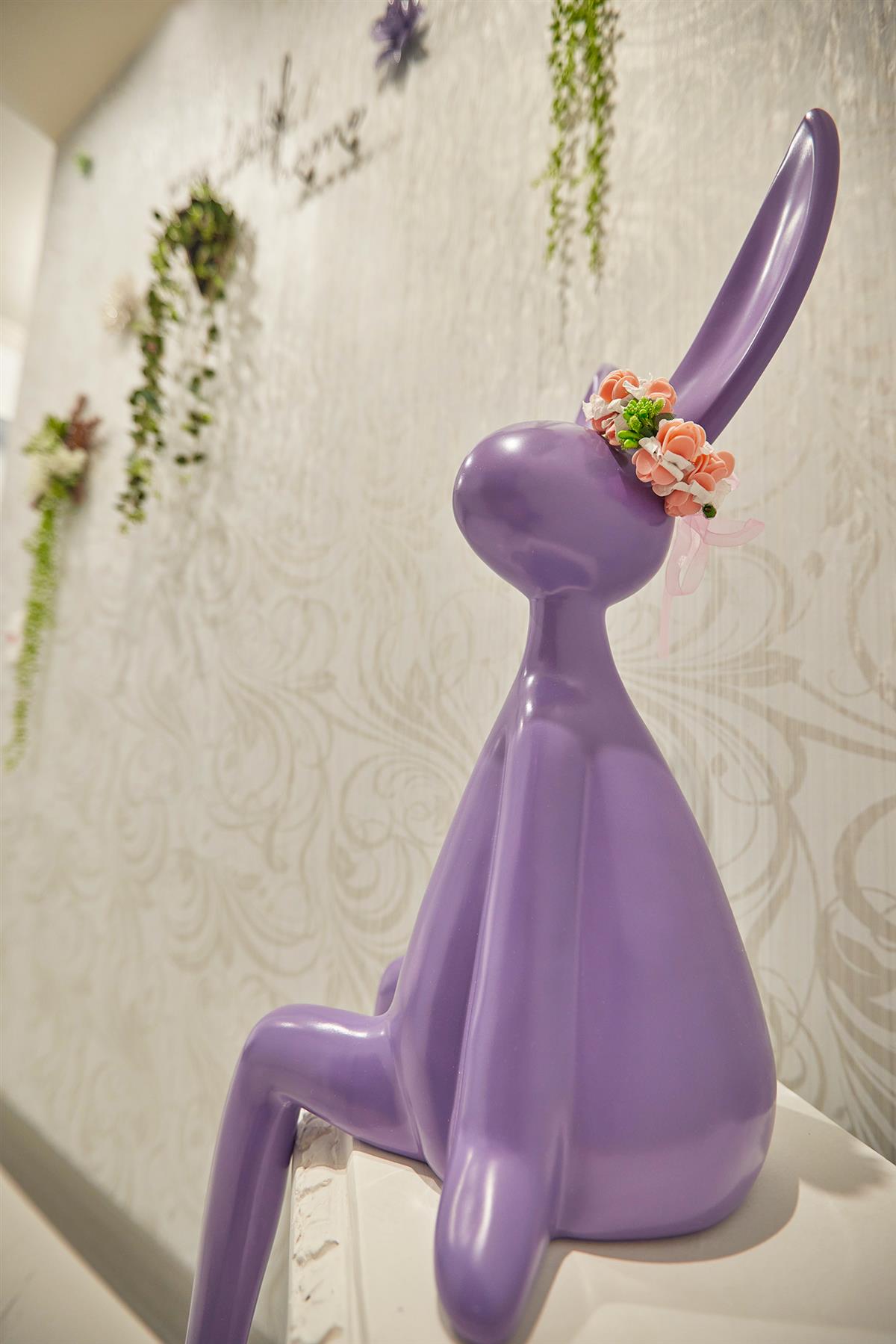 『室內粉嫩藍色系搭配牆上的白色童趣動物畫框, 各個不同材質的花朵散落在牆面,角落坐落著一隻可愛的兔子, 訴說著歡迎您的到來,一起倘佯在夢幻花海裡吧......』